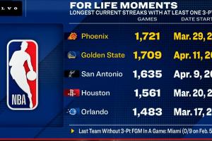 NBA球隊上一次出現(xiàn)全場沒進三分的情況還是在2016年2月6日(當?shù)貢r間2月5日),該場比賽熱火全隊三分9中0。