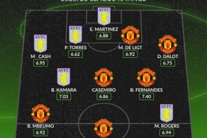前鋒:姆伯莫(曼聯(lián),6.92分)、庫尼亞(曼聯(lián),7.09分)、摩根·羅杰斯(維拉,6.94分)