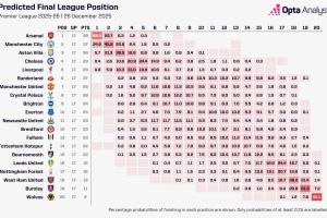 Opta預(yù)測(cè)英超:槍手奪冠概率68.5%第1曼城第2,狼隊(duì)降級(jí)概率99.9%