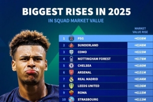 體育資訊12月28日訊 德轉(zhuǎn)已經(jīng)更新了各大聯(lián)賽球員身價,并據(jù)此統(tǒng)計了在2025年的俱樂部身價漲幅情況,新科歐冠冠軍巴黎領(lǐng)跑。