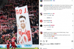 若塔的遺孀魯特爾也在賽后通過社媒曬出現(xiàn)場照表示感謝:“我由衷感謝俱樂部和所有球迷在這段無比艱難的時期所展現(xiàn)出的愛、尊重和支持。你們的留言以及行動讓我感動到難以用言語表達(dá)??”。