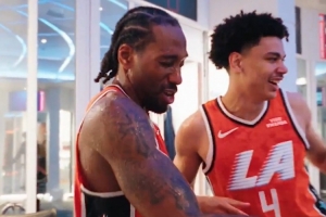 賽后,萊昂納德在更衣室被澆水慶祝,他打趣道:“我會給你們所有人寄送賬單。你們得讓我去編一次頭發(fā)???!?/p>