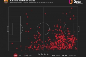 18歲的巴薩右邊鋒亞馬爾在今年各項(xiàng)賽事共計(jì)524次嘗試過人,285次成功過人是為五大聯(lián)賽球員同期最多。