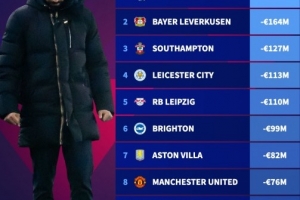 以下為2025年俱樂(lè)部身價(jià)下跌榜: