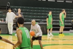 體育資訊9月23日訊 有俄勒岡大學(xué)籃球隊(duì)粉絲發(fā)布了一張球隊(duì)在主場球館訓(xùn)練的照片,從照片中可以看到除了在訓(xùn)練的隊(duì)員之外,場邊還站著穿著便裝的林葳。