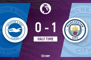 上半場(chǎng)傷停補(bǔ)時(shí)3分鐘,半場(chǎng)結(jié)束,曼城暫1-0布萊頓。