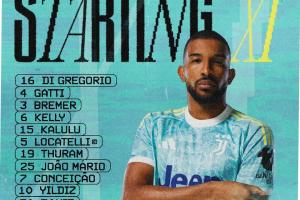 尤文首發(fā):16-迪格雷戈里奧、3-布雷默、4-加蒂、6-凱利、15-卡盧盧、25-馬里奧、5-洛卡特利、19-凱夫倫-圖拉姆、7-小孔塞桑、10-伊爾迪茲、30-喬納斯-戴維