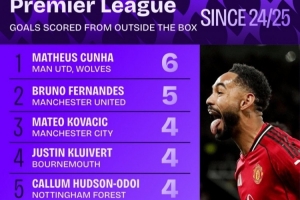 體育資訊10月26日訊 曼聯(lián)在本輪英超4-2力克布萊頓,庫(kù)尼亞遠(yuǎn)射建功。數(shù)據(jù)統(tǒng)計(jì)顯示他也是上賽季至今英超禁區(qū)外破門次數(shù)最多的球員。