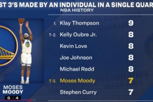 據(jù)統(tǒng)計(jì),穆迪單節(jié)7記三分,與庫里并列歷史第三多,NBA歷史單節(jié)三分紀(jì)錄由克萊保持(9記)。