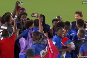 在比賽結(jié)束后,海地球員圍在一起等待哥斯達(dá)黎加vs洪都拉斯的結(jié)果。比賽結(jié)束后,海地球員瘋狂慶祝。