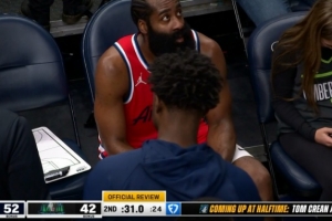 GIF-哈登三分被戈貝爾墊腳,裁判吹罰后者一級惡意犯規(guī)
