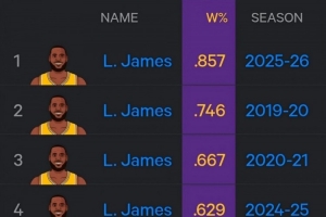 本賽季詹姆斯出戰(zhàn)時6勝1負(fù),86.7%的勝率暫列湖人單賽季生涯新高。