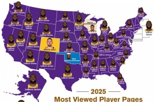 BBR曬2023年各州被瀏覽次數(shù)最多球員:詹姆斯在41個州處于領(lǐng)先地位