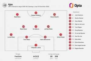 據opta數據統(tǒng)計,這是阿賈克斯隊史首次在歐冠首發(fā)中派出兩名17歲或17歲以下的球員。