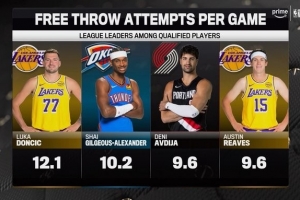 NBA杯1/4決賽今天進(jìn)行,賽前轉(zhuǎn)播方曬出本賽季罰球次數(shù)前四: