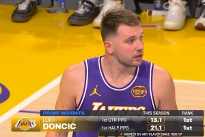 湖人VS馬刺,轉(zhuǎn)播方曬出統(tǒng)計,東契奇場均首節(jié)13.1分&上半場21.1分,都是有統(tǒng)計(96-97賽季)以來的最高。