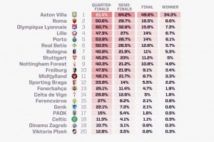opta預(yù)測(cè)歐聯(lián)杯:阿斯頓維拉奪冠概率34.3%,羅馬8.6%第二