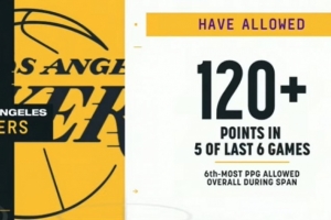 備注:湖人近6場(chǎng)失分為聯(lián)盟第6多