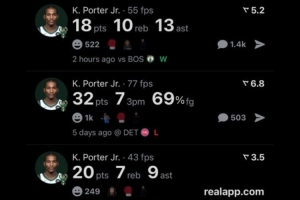過(guò)去五場(chǎng)比賽,小波特連續(xù)四場(chǎng)得分20+,其中兩場(chǎng)30+,第五場(chǎng)則砍下18+10+13的三雙。