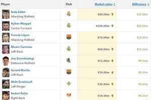 西甲身價漲幅榜:居萊爾+3000萬第1 姆巴佩+2000萬 費爾明+1000萬