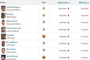 體育資訊12月12日訊 德轉(zhuǎn)更新西甲身價,跌幅排行中,貝林厄姆、羅德里戈和桑塞特下跌2000萬歐最多。
