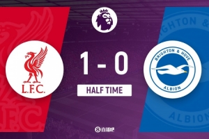 傷停補(bǔ)時(shí)3分鐘。上半場(chǎng)比賽結(jié)束,利物浦1-0布萊頓。