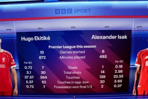 以下為利物浦兩大鋒線新援?;倏?、伊薩克本賽季英超數(shù)據(jù)對(duì)比,具體如下(括號(hào)內(nèi)為每90分鐘數(shù)據(jù)):