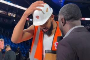 GIF-唐斯賽后頭戴安全帽,身穿建筑背心接受采訪