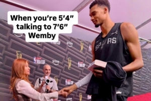 NBA女記者Rachel Nichols曬出了與文班握手照,配文:“當(dāng)1米63的你和2.32的文班(實(shí)為2米24)對話?!?/p>