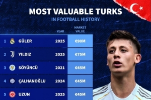 體育資訊12月14日訊 德國(guó)轉(zhuǎn)會(huì)市場(chǎng)列出了土耳其球員歷史身價(jià)排名,居萊爾9000萬(wàn)歐居首,伊爾迪茲7500萬(wàn)歐次席。