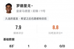 體育資訊12月15日訊 2025-26賽季西甲第16輪,皇馬對(duì)陣阿拉維斯,羅德里戈首發(fā)出戰(zhàn),打進(jìn)1粒進(jìn)球,1次過人成功,傳球成功率達(dá)到96.7%,評(píng)分7.9。