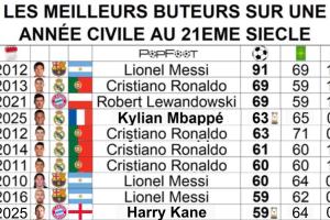 在21世紀(jì)自然年進(jìn)球榜上,姆巴佩63球的成績已經(jīng)超越2012年的C羅來到第4。在2025年皇馬僅剩2場(chǎng)比賽,想達(dá)到2013年C羅、2021年萊萬的69球已經(jīng)幾乎不可能。在這份榜單的榜首,2012年梅西的91球仍遙不可及。