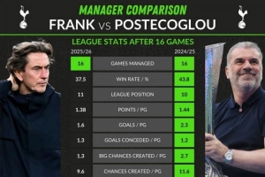體育資訊12月15日訊 熱刺在本賽季英超高開(kāi)低走,whoscored也對(duì)比了新帥弗蘭克本賽季前16輪和前任澳波上賽季前16輪的關(guān)鍵數(shù)據(jù),弗蘭克完敗。