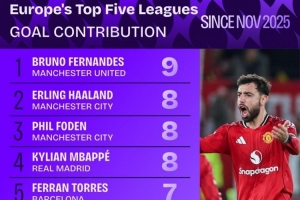 據(jù)Squawka統(tǒng)計(jì),B費(fèi)今年11月以來聯(lián)賽參與9粒進(jìn)球,五大聯(lián)賽同期參與進(jìn)球最多。