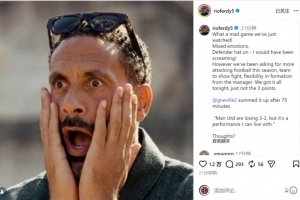 曼聯(lián)名宿費迪南德社媒曬出自己一臉驚訝的照片,并寫道:“我們剛剛看了一場多么瘋狂的比賽!心情復雜。以防守球員的身份來說——我(要是還在場上)肯定會大喊大叫!”